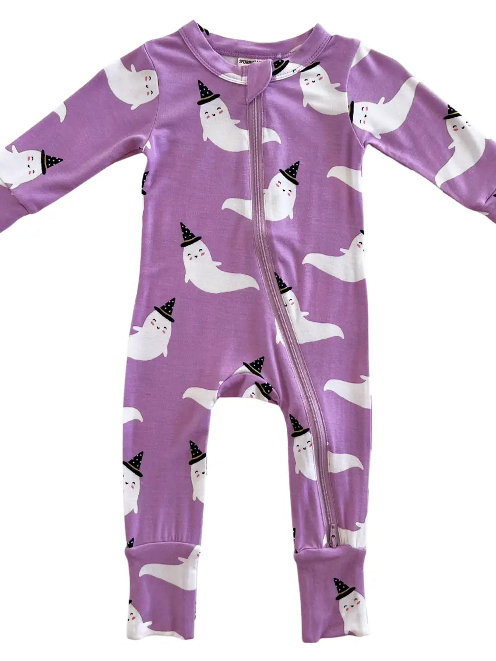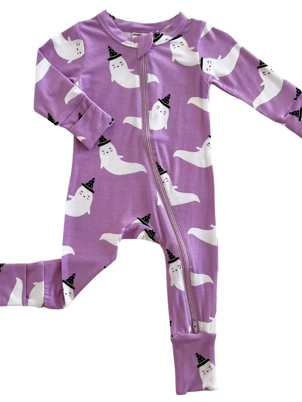 Celebrate Halloween in style with this adorable 2-way convertible zip romper! Featuring a ghost wearing a witch hat on a fun purple background, this piece will bring out your baby's cuteness and spooky vibes. Watch them twirl and jump in excitement!