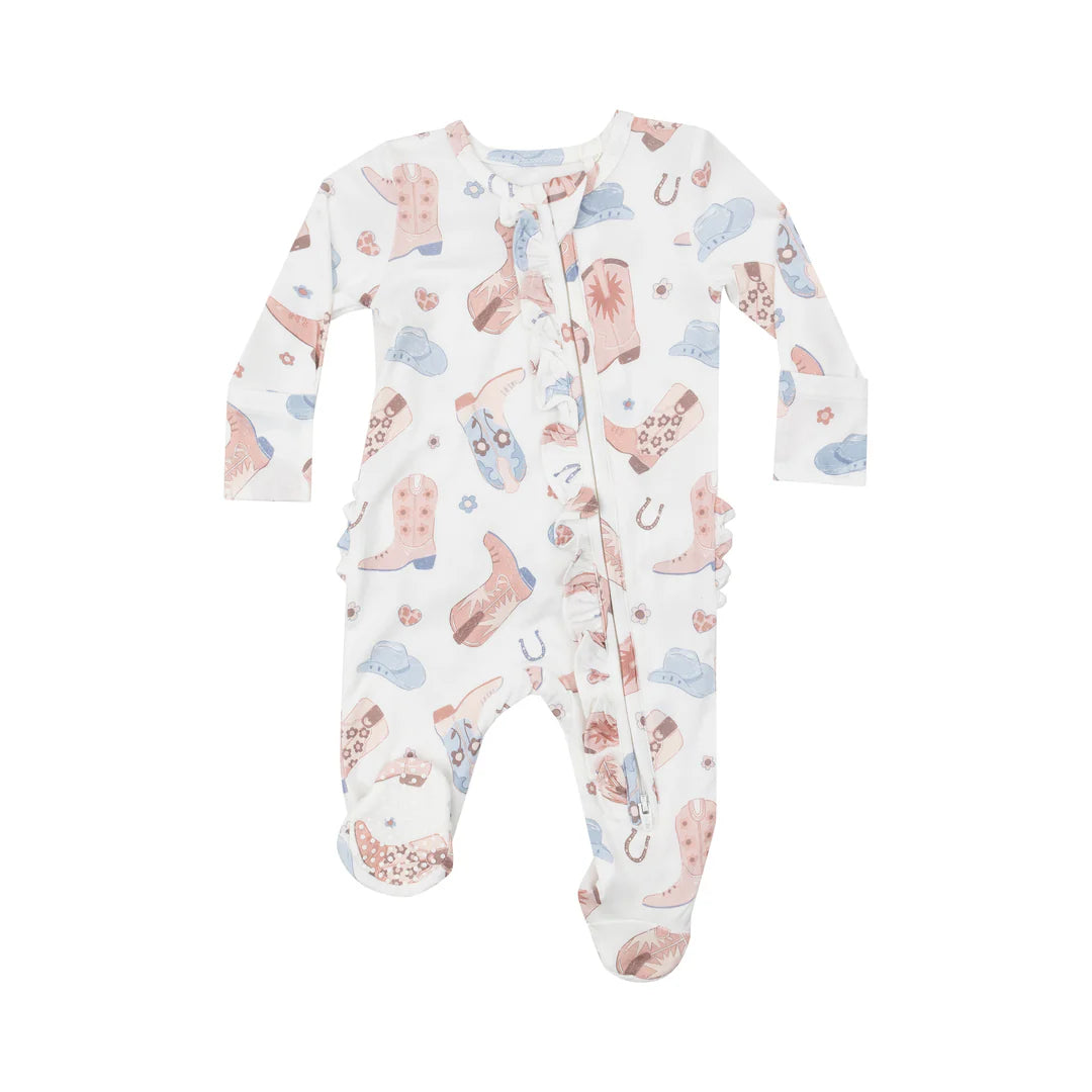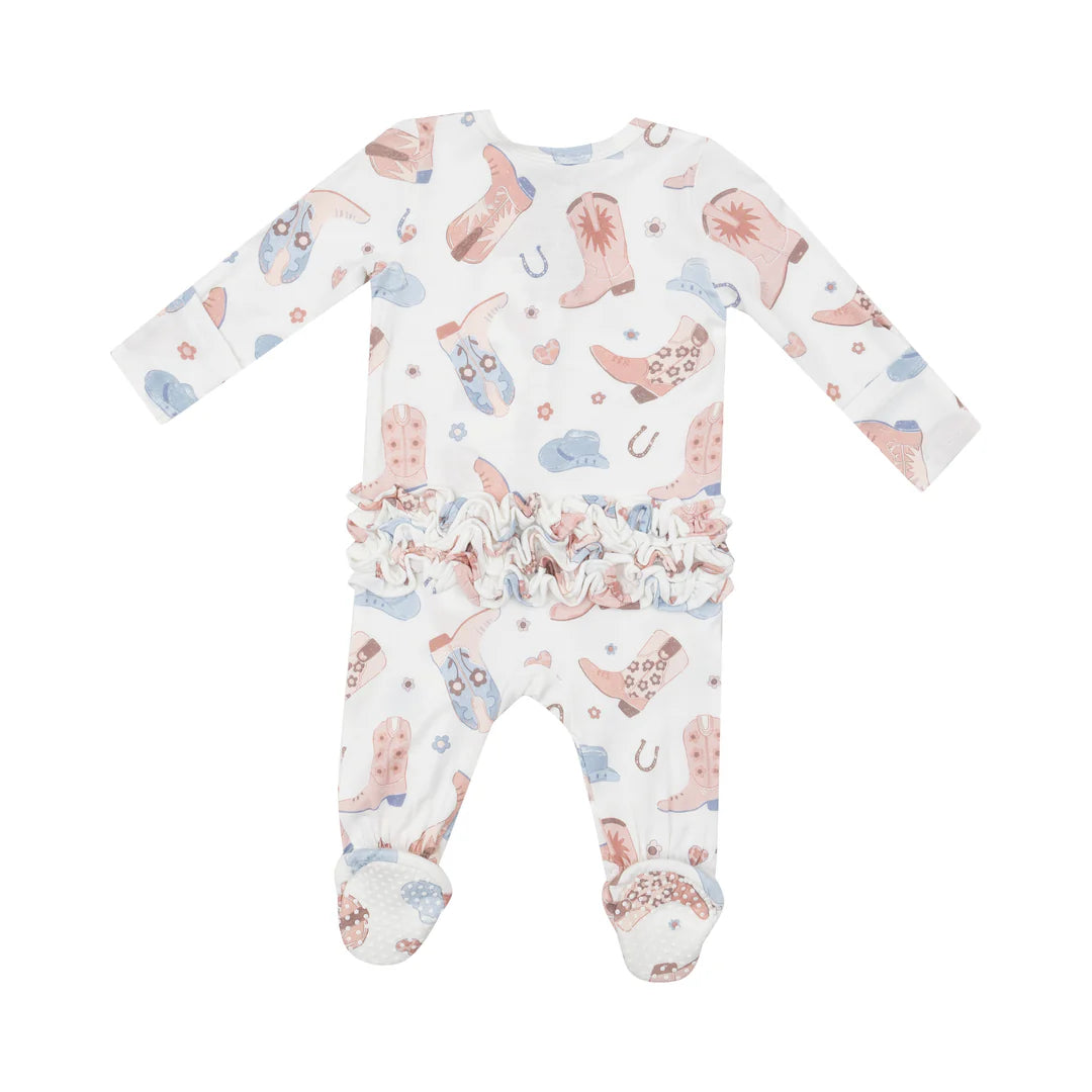 2 Way Ruffle Zipper Footie - Cowboy Boots Pink