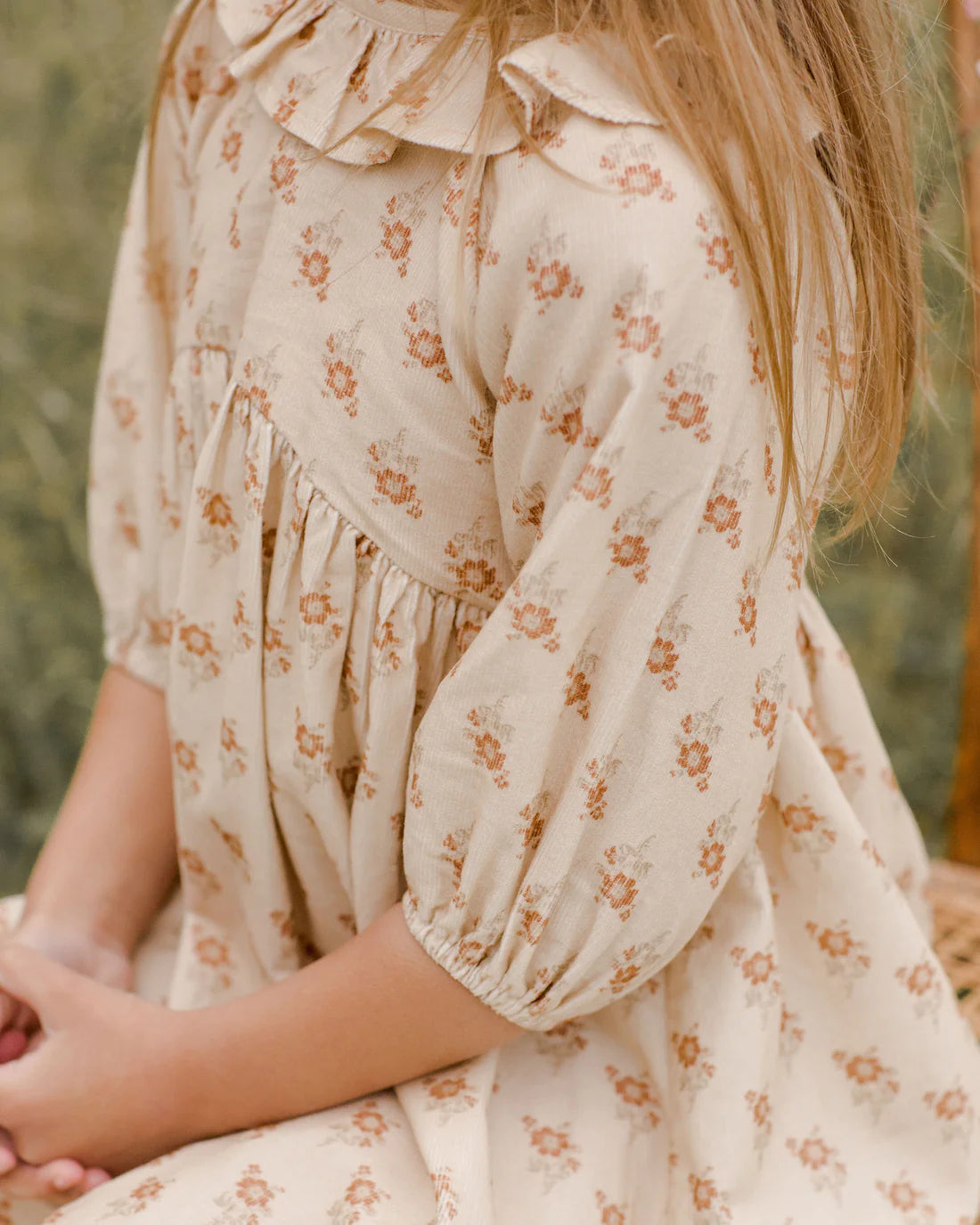 This sophisticated dress is made of corduroy with playful ruffle collar and balloon sleeves. Zipper back closure.
