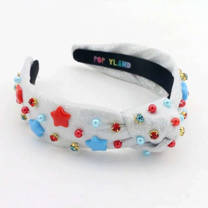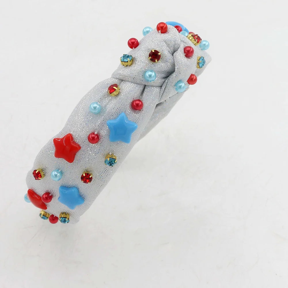 O say can you see.... how cute this will look on your all American girl? Our American Girl headband has a sparkly silver base with red and blue stars and gems. The perfect accessory with your red, white, and blue! Child size, but can fit most!