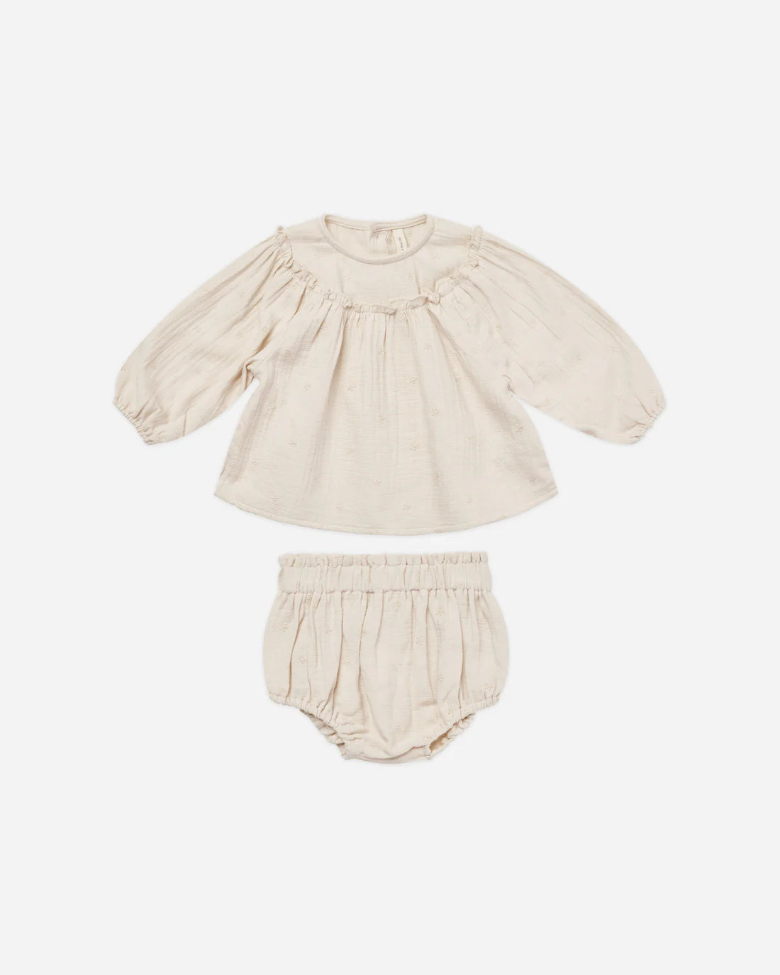 This Balloon Sleeve Blouse and Bloomer Set is timeless in design and soft and airy with a cotton gauze fabric. Featuring a full gathered blouse with ruffled neckline, balloon sleeves, button backing, and matching bloomers, this set is a must-have.