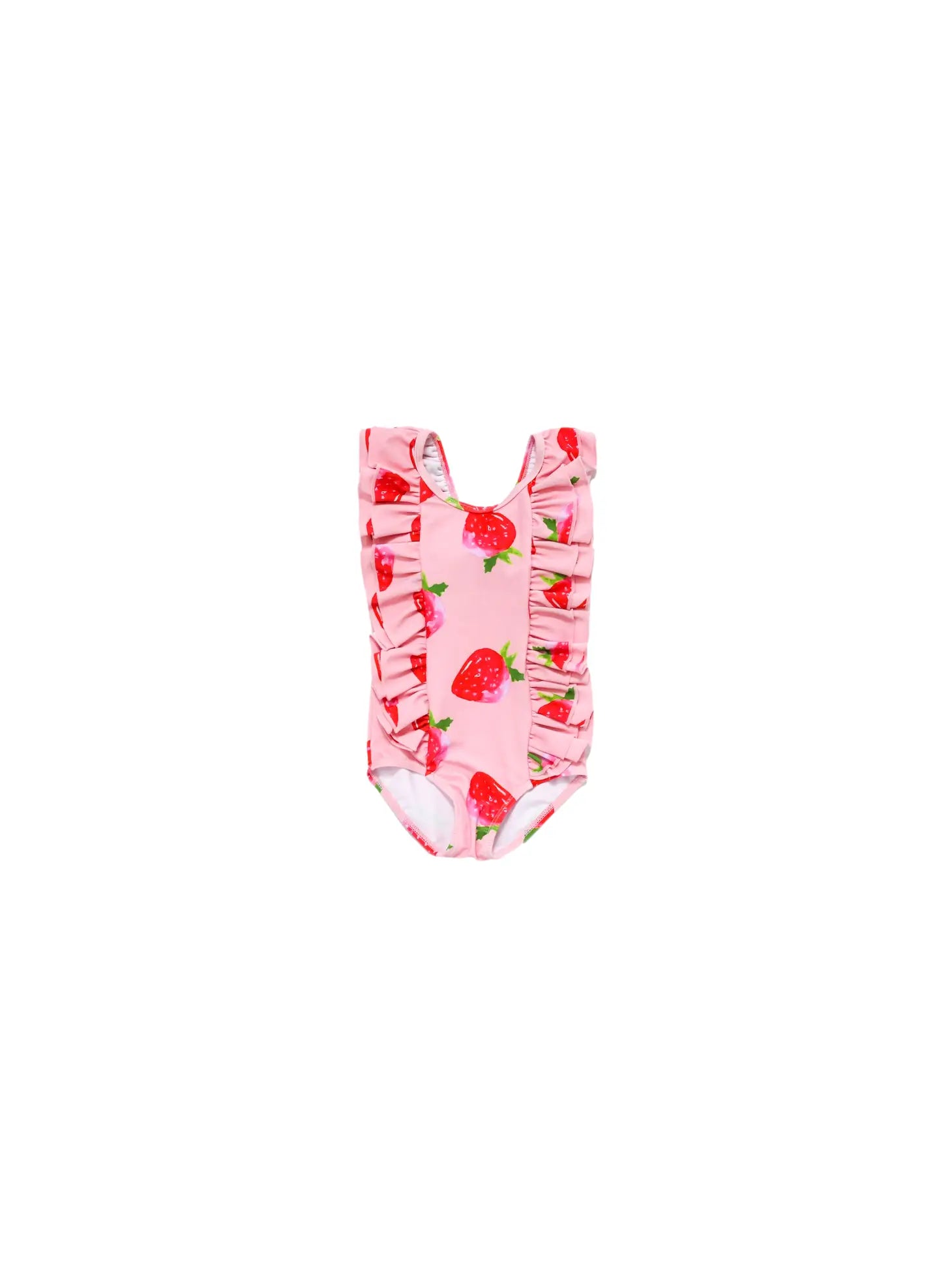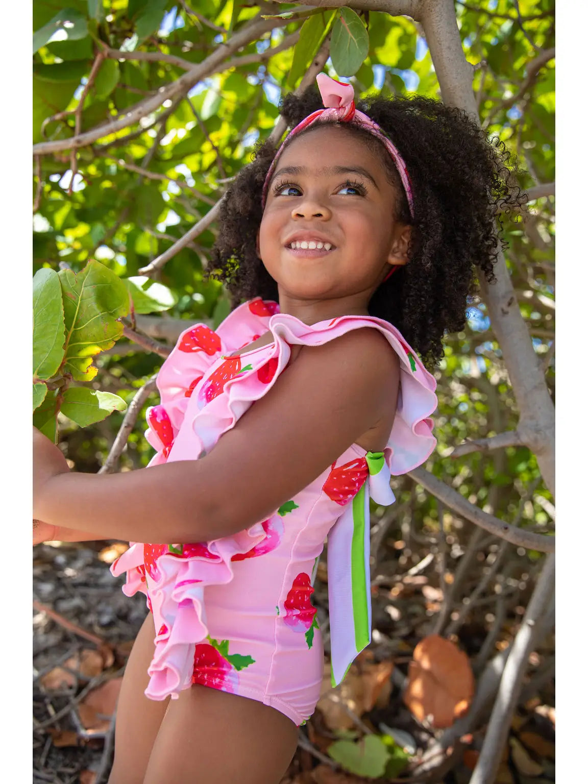 This one piece style features all the bells and whistles with its cascading ruffles and beautiful bow detail on the back. The ruffles extend down the straps in the back and meet in the middle with a beautiful white bow made for all princesses on the beach.