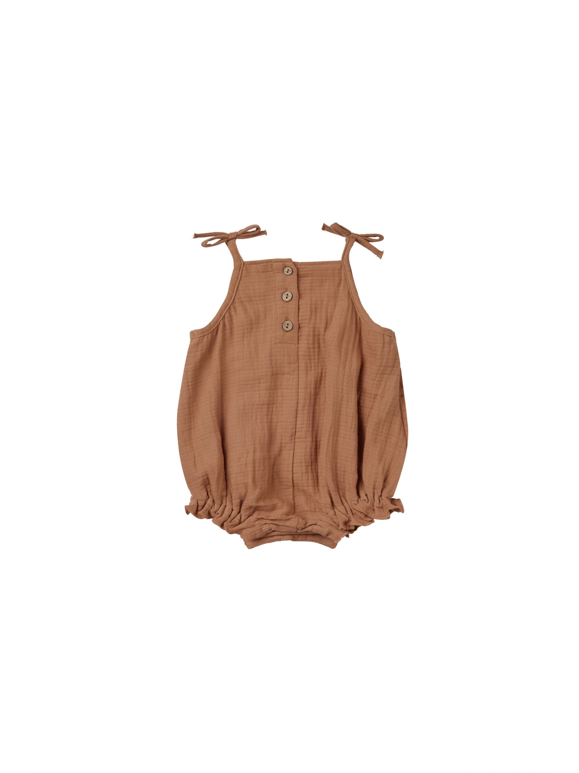 This romper features a smocked front bodice, button closure at the back, elastic leg openings with ruffle detail, and bottom snap closure to ensure easy changing.
