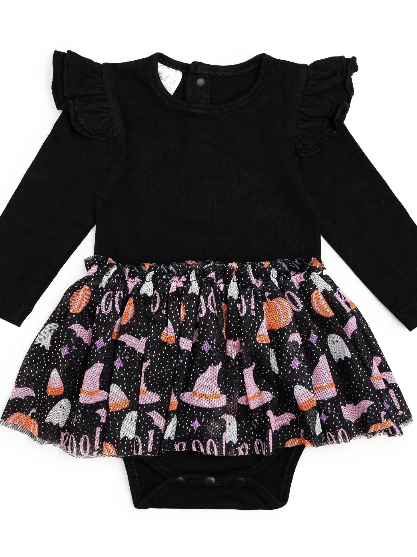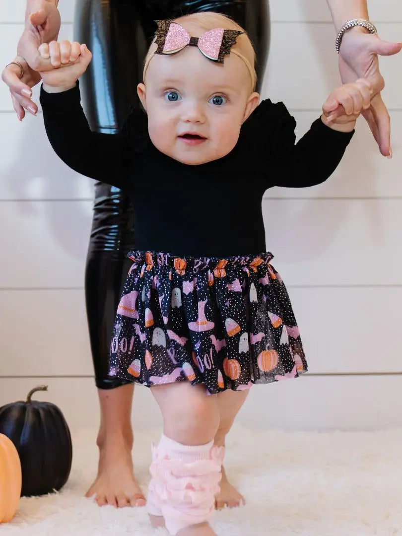 The boo halloween long sleeve tutu bodysuit is a fun and festive bodysuit for babies celebrating halloween!