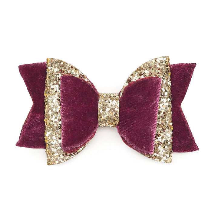 This Sweet Wink clip has a velvet bow accented with a gold glitter bow. The alligator clip is ribbon-covered to help grip the hair.