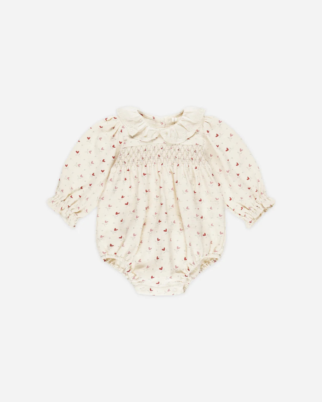 We are loving this new style! The Callie Romper comes with an embroidered collar, smocked front, gathered long sleeves, buttons at the back and snaps at the bottom for easy wear.