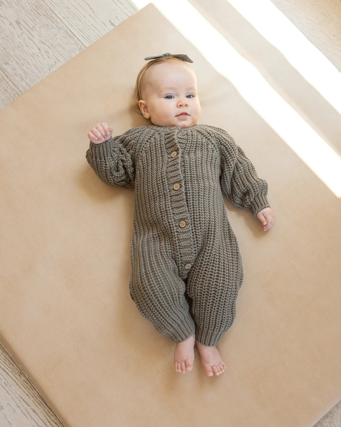Chunky Knit Jumpsuit made of soft and chunky sweater knit, that is sure to keep you little one cute and cozy this fall. Featuring coconut buttons down the front and a relaxed fit.