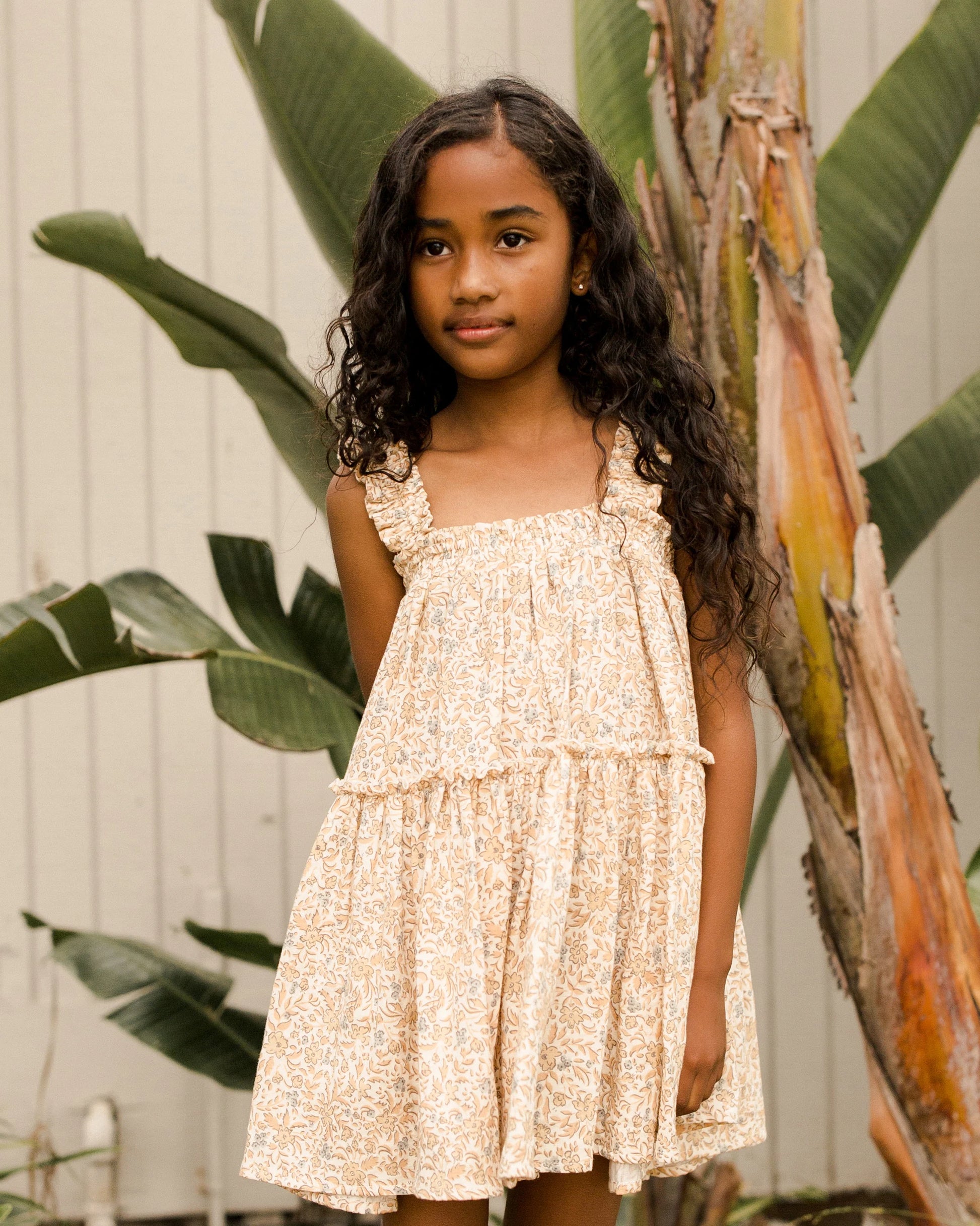 This woven cotton gauze dress has fluttered sleeves, gathering along chest and second tier of the full bodied skirt.