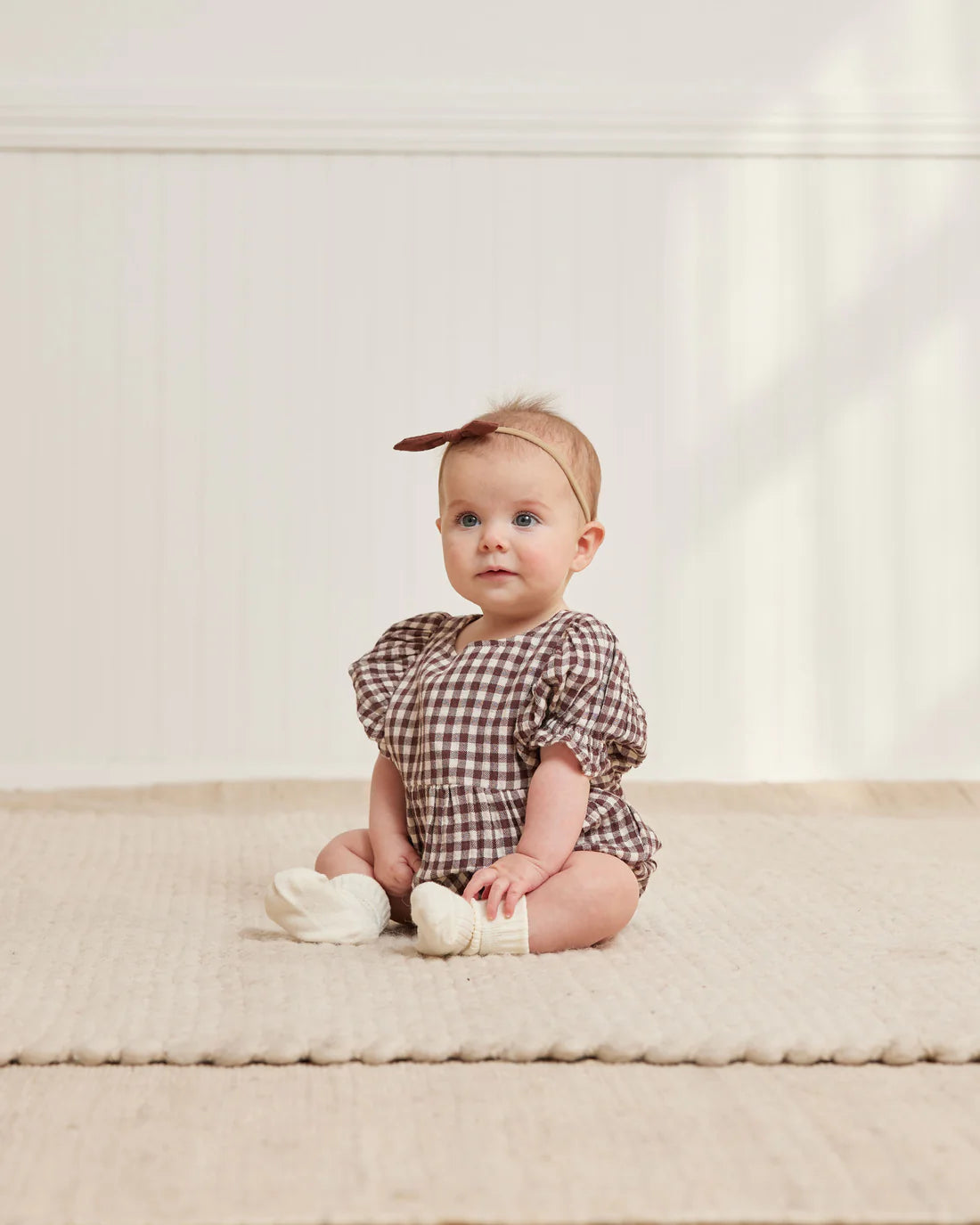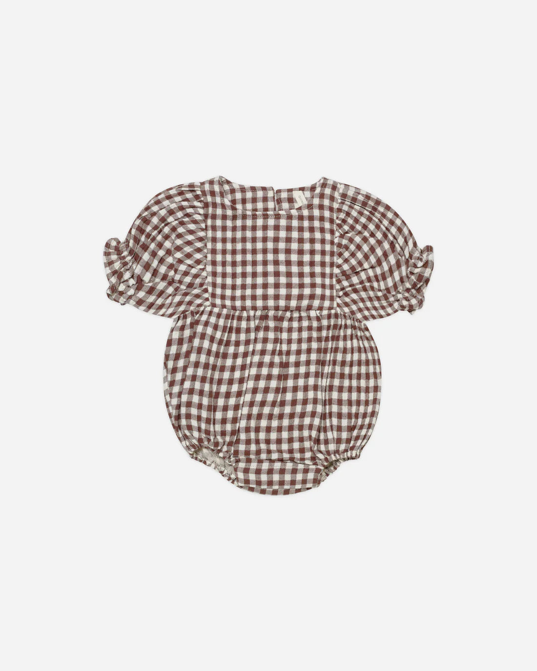 The Cosette Romper is created with a lightweight cotton gauze making it the perfect layerable outfit to transition into cold weather. Oversized and gathered balloon sleeves, elastic ruffle trim, gathered waist, and hidden snaps add all the perfect details.