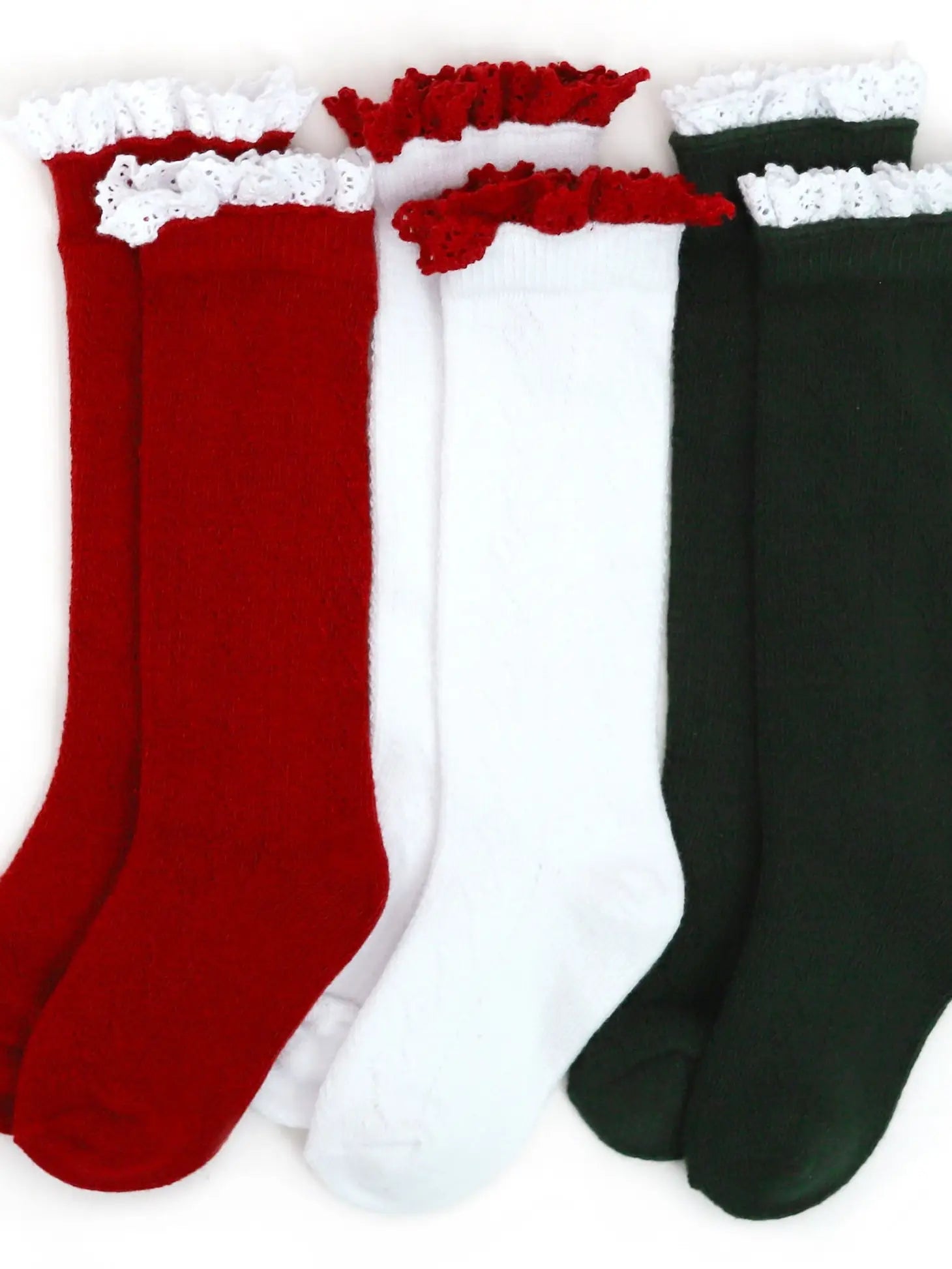 Fancy Christmas Knee High Socks 3-Pack Knee Highs are meant to hit just below the knee. Slight variations in sock length are normal. Machine wash cold with like colors. Tumble dry low or lay flat to dry. 79% cotton / 19% polyester / 2% spandex