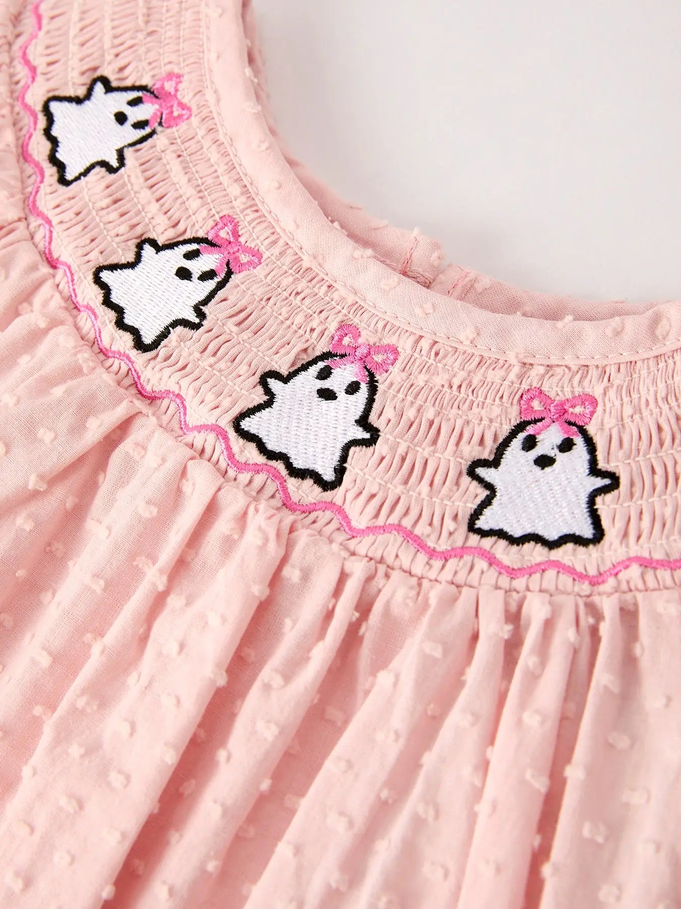 Halloween Light Pink Ghost Embroidery Smock Dress