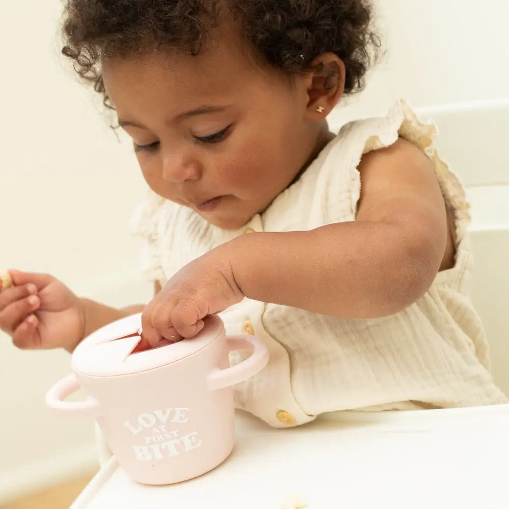 Exclusively ours, the Happy Snacker is the first two piece silicone snack cup! No more trails of crumbs to pick up thanks to our snap tight lid - go ahead and put the vacuum away. Designed with easy grip handles for little hands to independently self-feed. Hold the applause because there’s more… The horizontal handles allow the cup to securely fit in the car seat and stroller cup holders. The simple two-piece design makes pouring in snacks a breeze! The mess proof, tight lid stays in place. The soft silicone opening allows little hands to easily access food and prevents spills. Just pop the lid off when you are ready to clean it, each piece is dishwasher safe. Happy snacking!