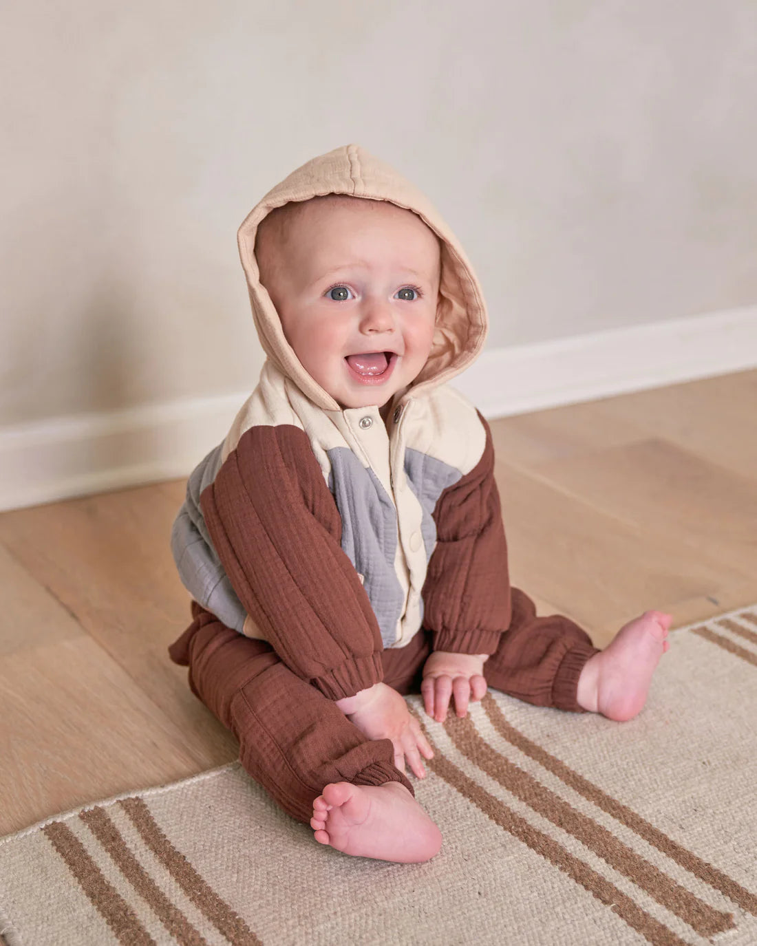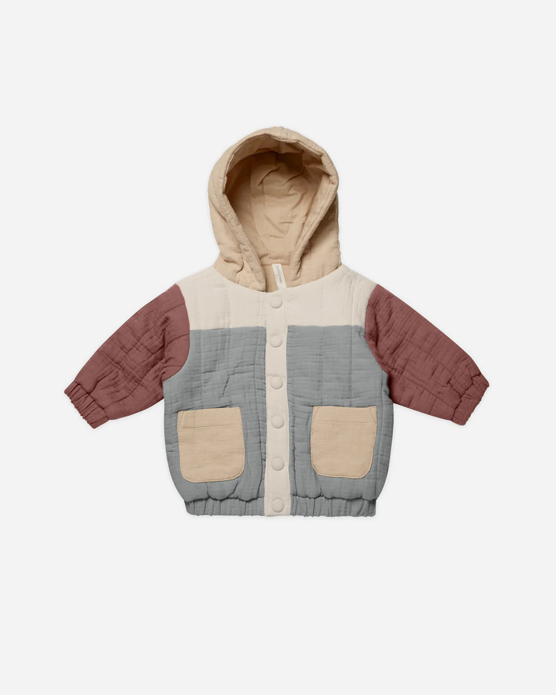 The Hooded Woven Jacket features patch pockets, fabric covered snaps, elastic sleeve openings, and a cozy hood for the cooler days ahead. The color blocking pattern with cream, plum, and dusty blue hues add a modern touch to this classic fit.