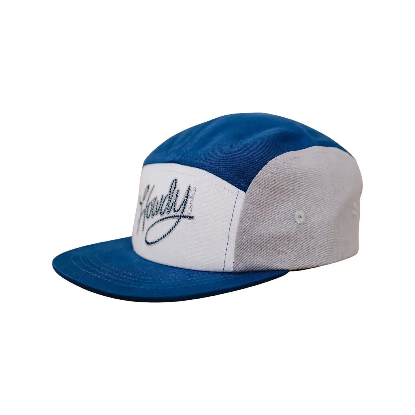 Fabric : 100% Cotton Navy Blue, white and grey 5 panel Navy blue brim with "howdy" embroidery logo Embroidered White Stars on back over plastic strap