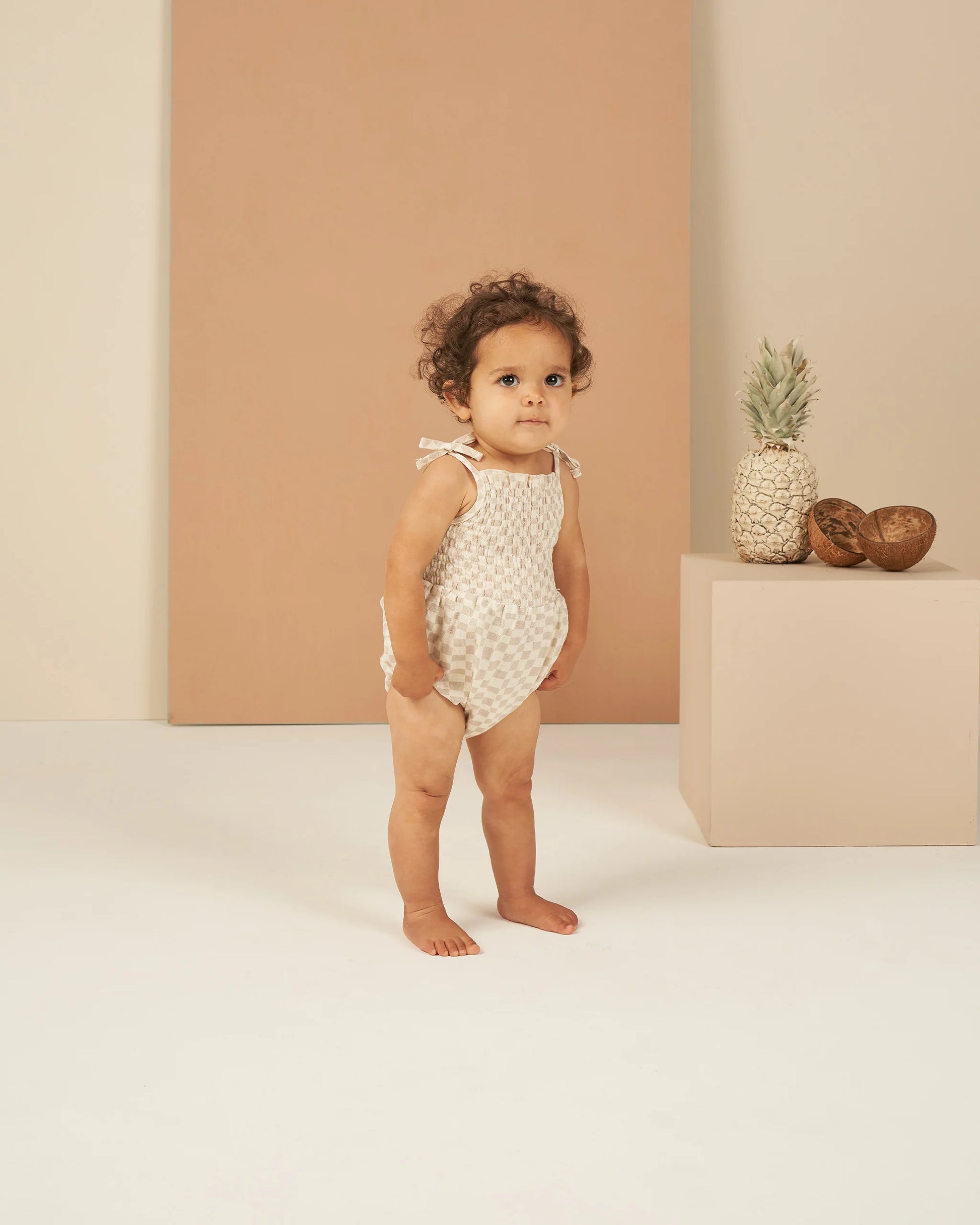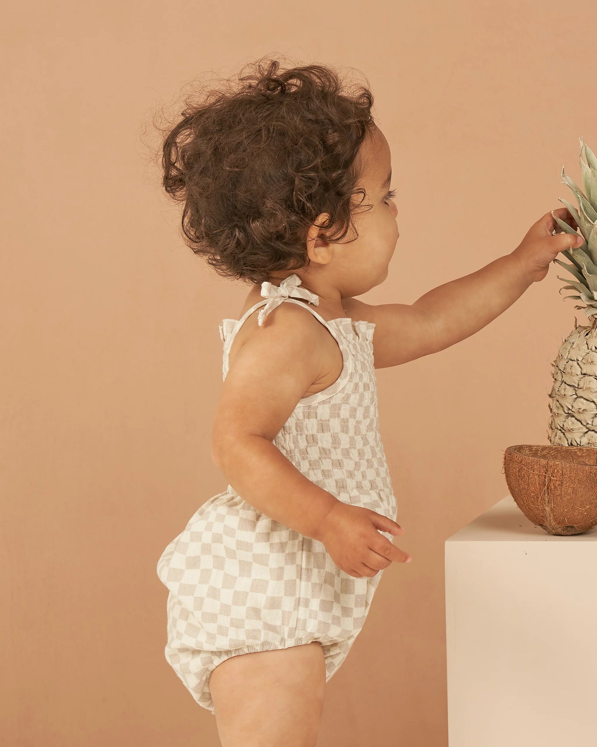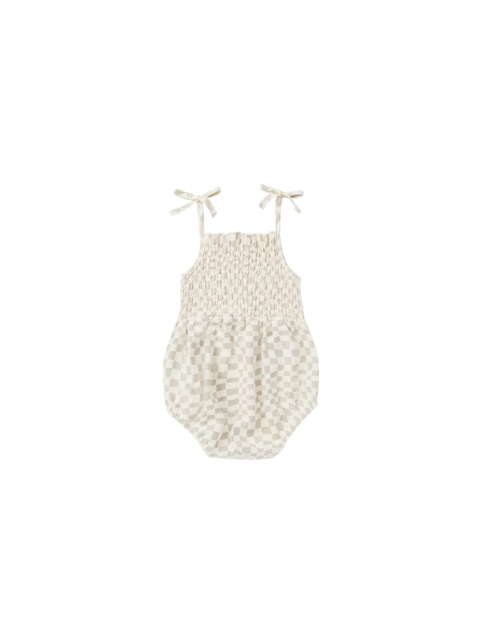 This breathable woven romper features fixed tie straps, smocked bodice, and snaps along bottom for easy changes.
