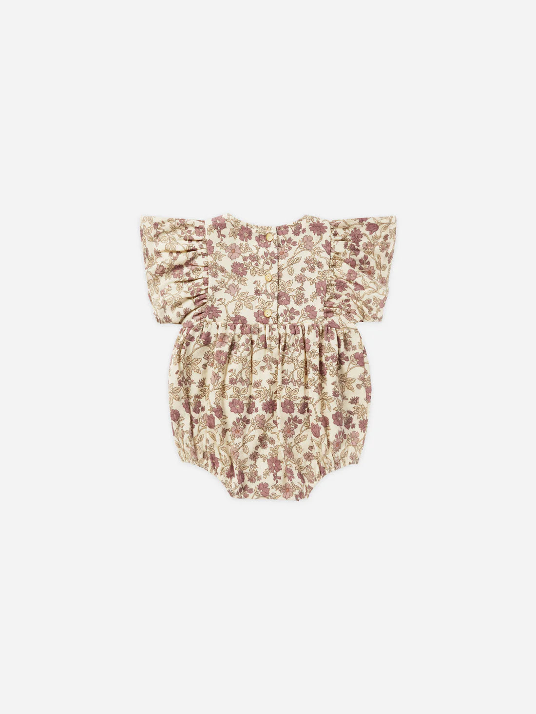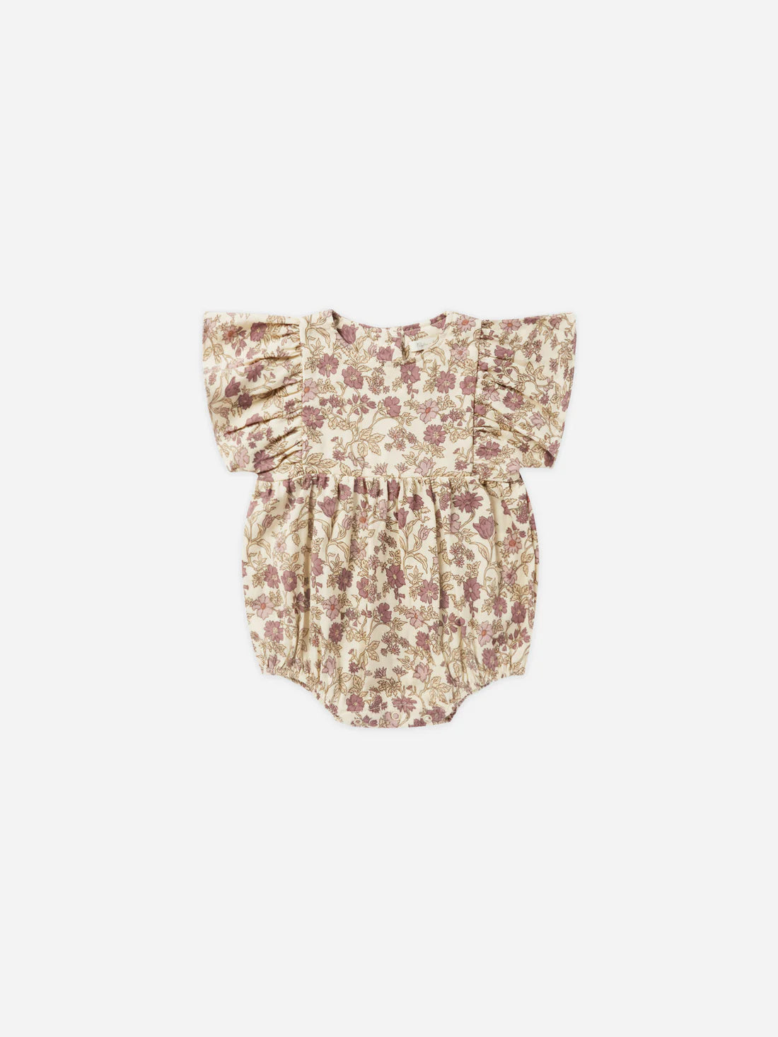 Our Kalea Romper features gathered flutter sleeves and mango button back closure. Snaps along the bottom opening for easy changing.