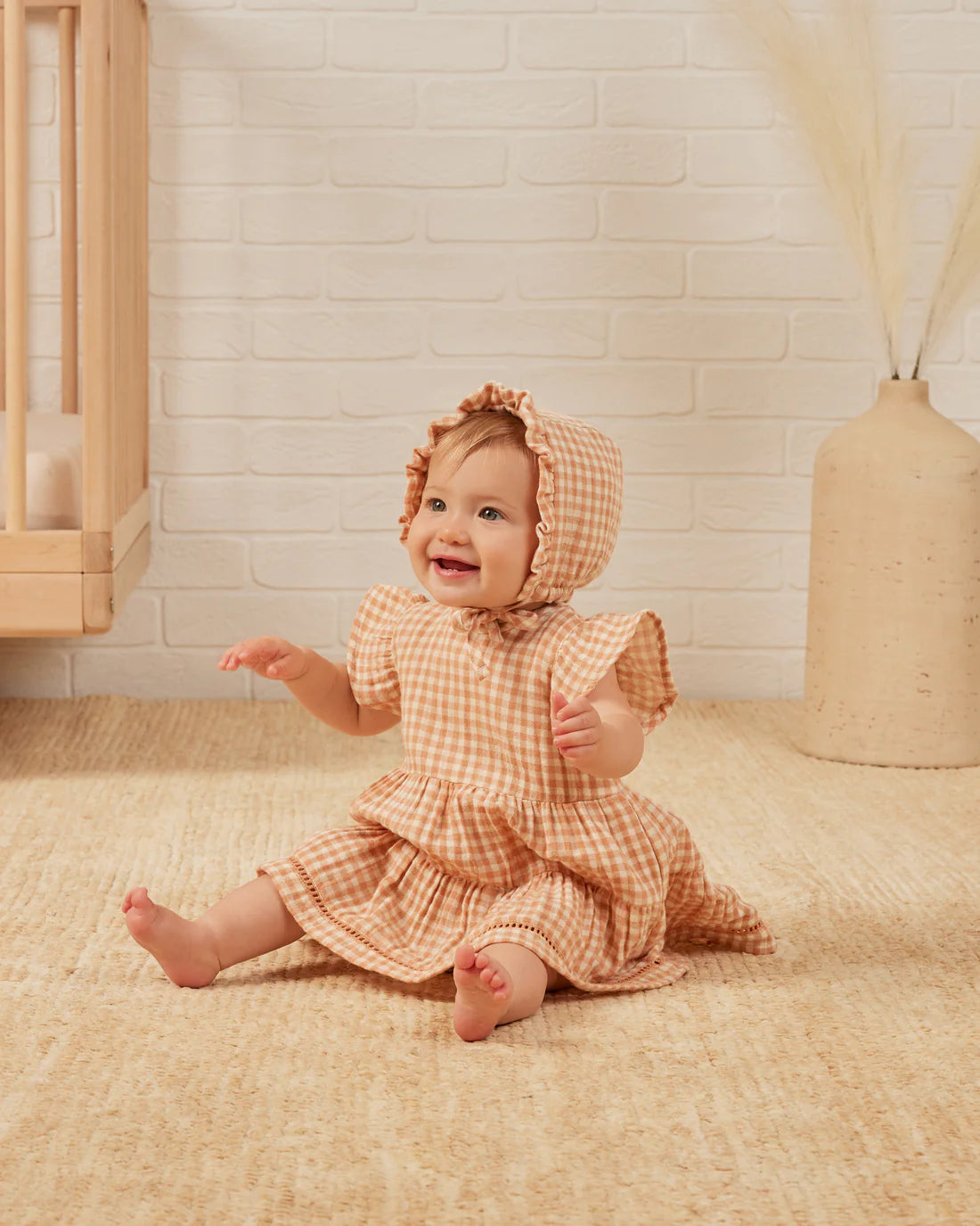 Multiple tiers, ruffles, and trims make up this beautiful short sleeve Belle dress in our organic cotton gauze fabric, complete with button-back neck closure. All sizes include bloomers.