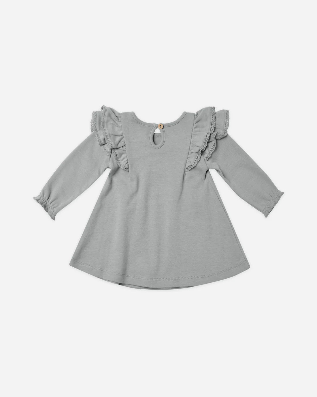 Velvety soft flutter long sleeve baby dress with button back neck closure. Pairs perfectly with our gathered bloomers!