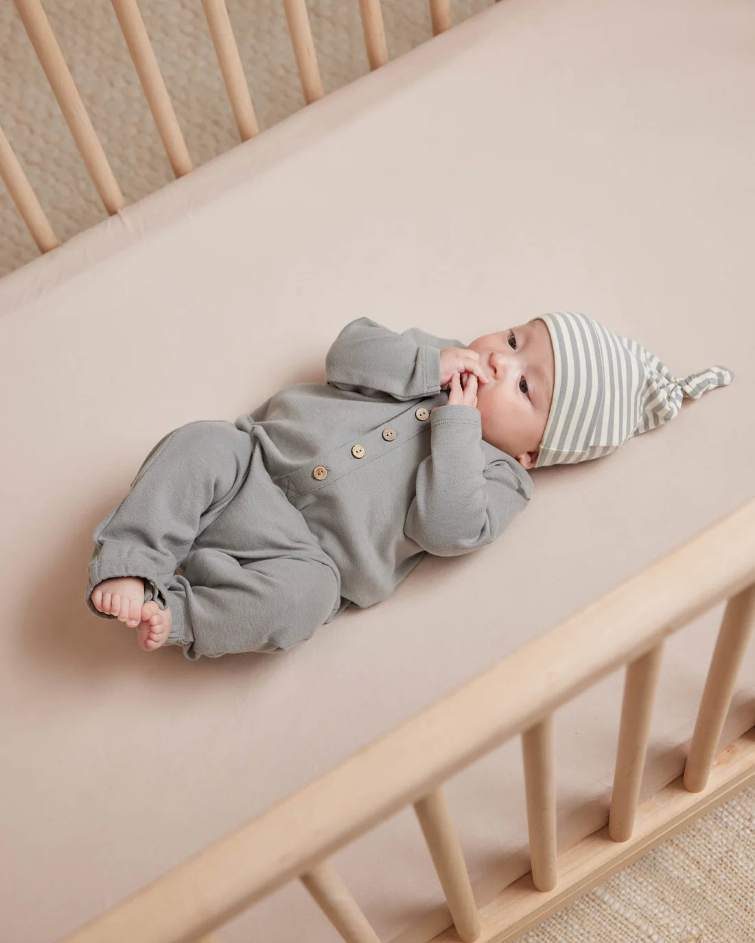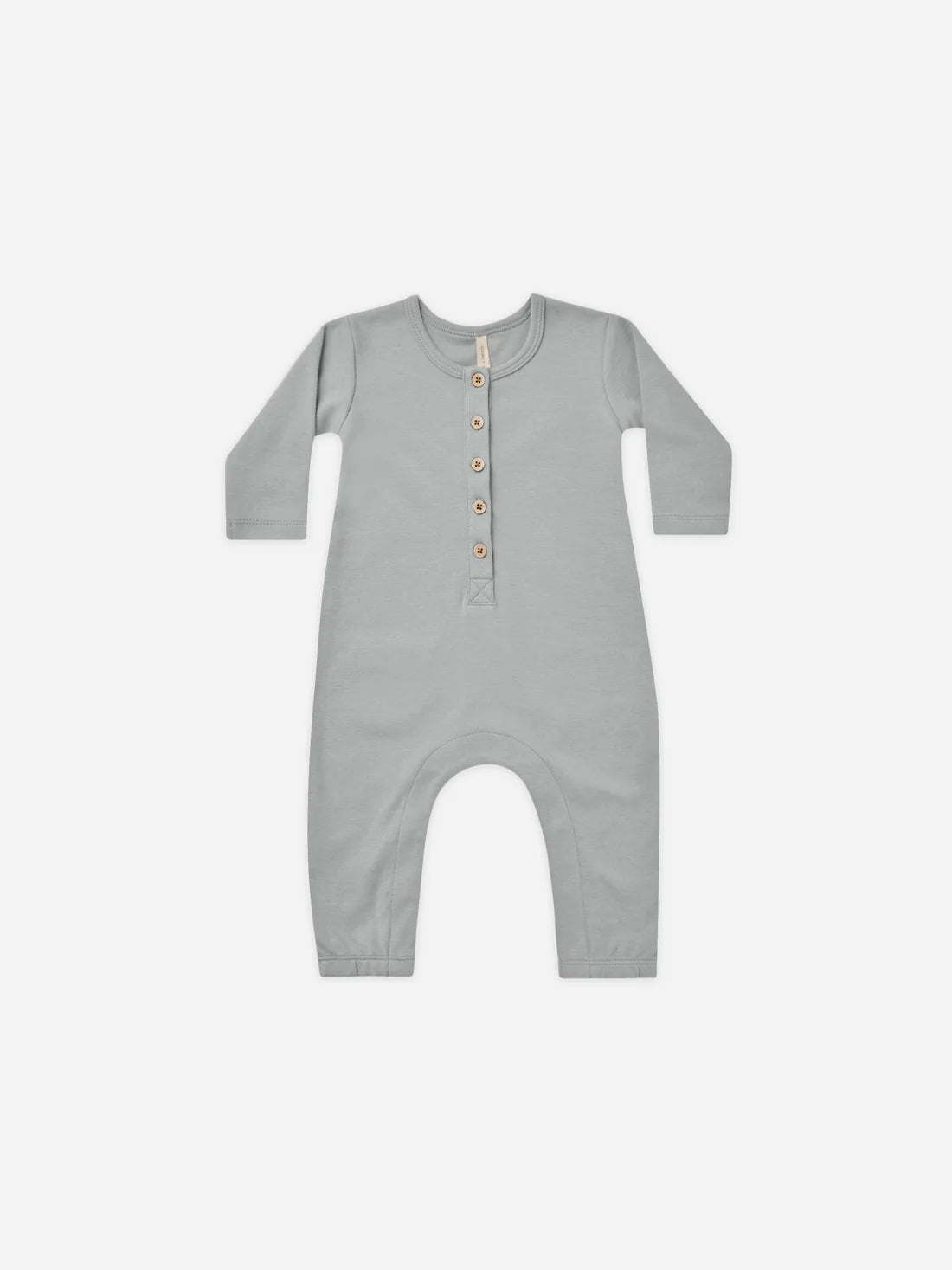 Velvety soft long sleeve jumpsuit with coconut buttons down the chest, and hidden snaps along the inseam (0-3m - 18-24m, 2-3y does not have snaps) for easy changing.