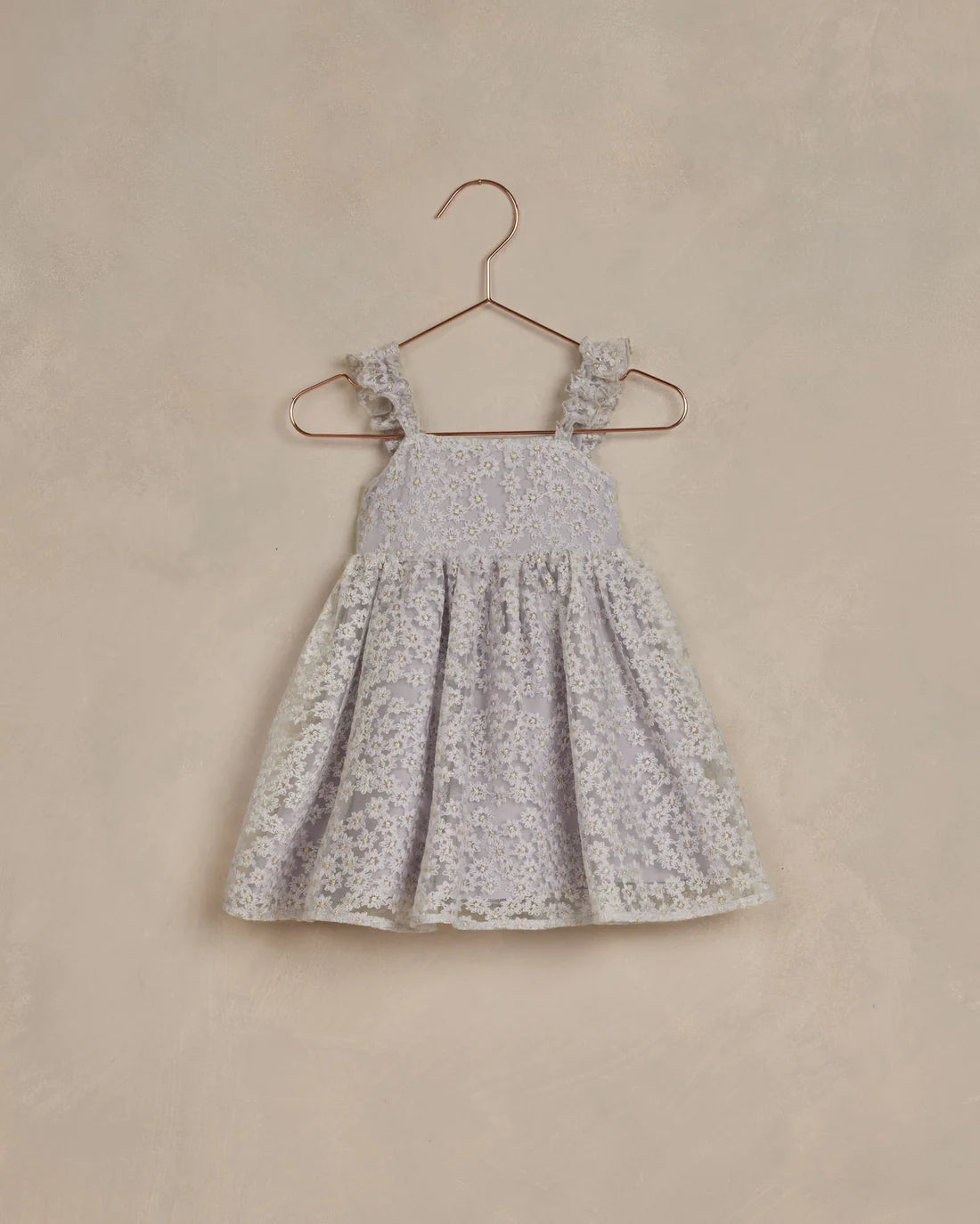 This dress has a full gathered skirt with an empire waist features all-over daisy embroidery and ruffled elastic straps. Featuring a smocked back bodice with a soft viscose liner.