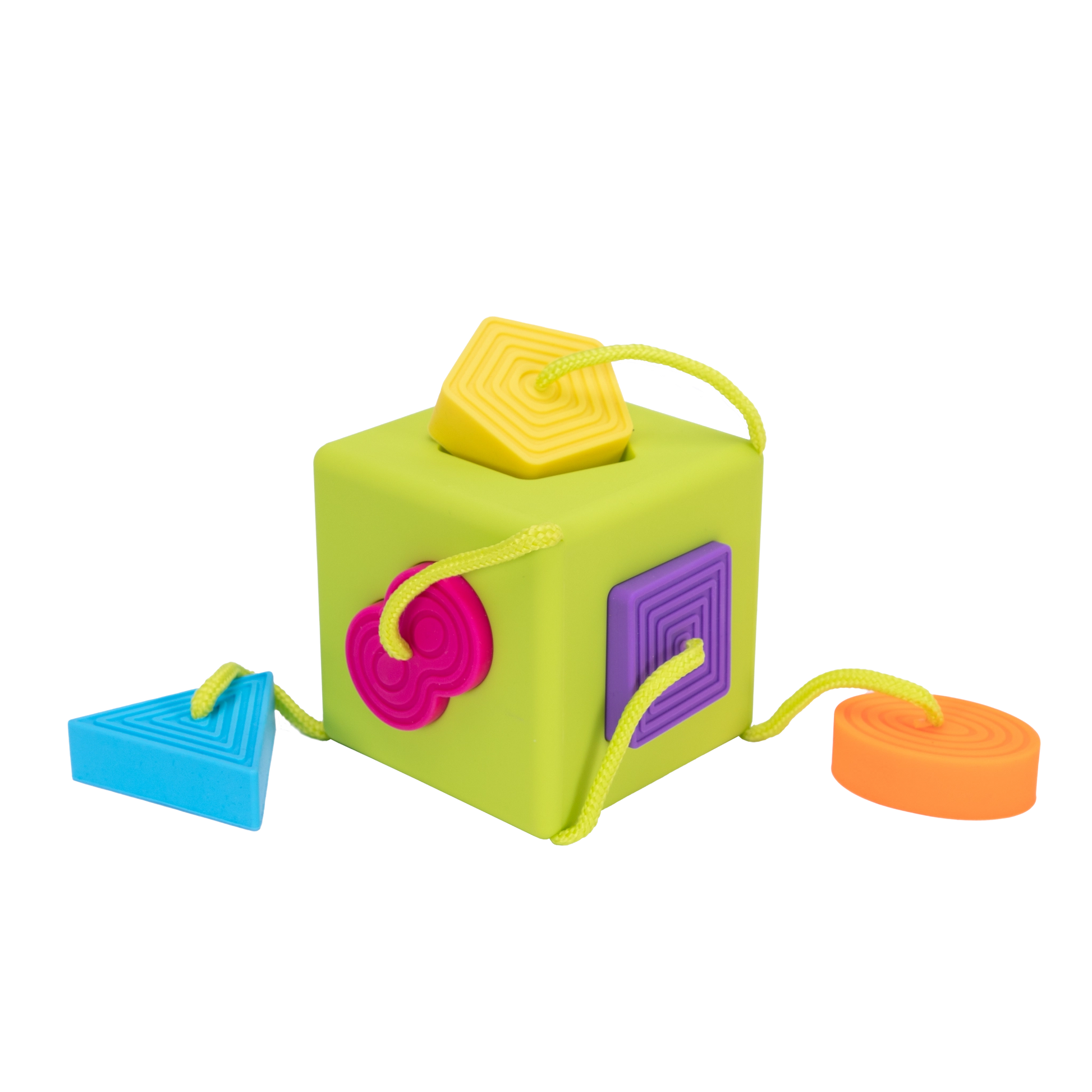 - Shape-sorting cube with 6 rubbery shapes tethered to its corners