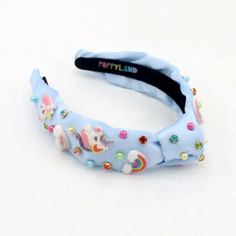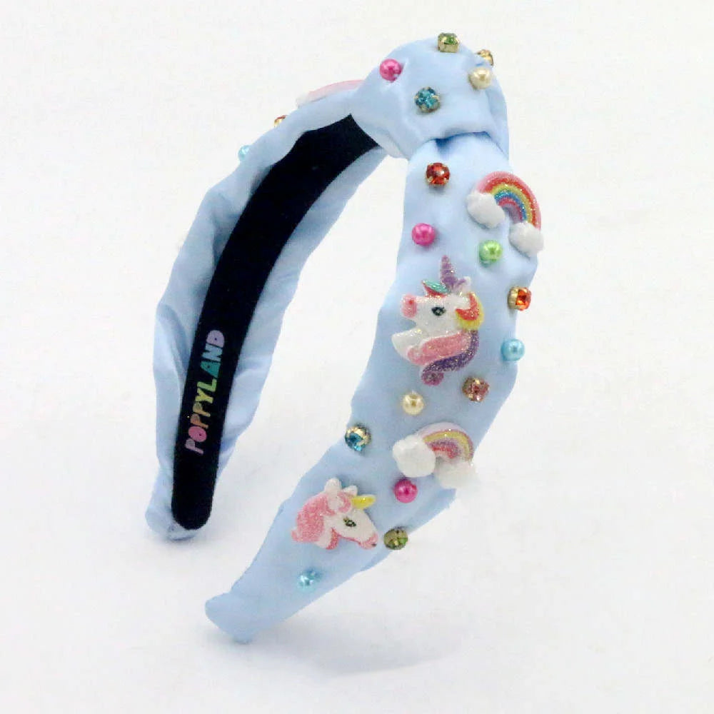 Somewhere over the rainbow was this most perfect headband! Adorned with glittered rainbows and unicorns, this headband is certain to become a daily favorite! Blue canvas fabric with magical unicorn charms.