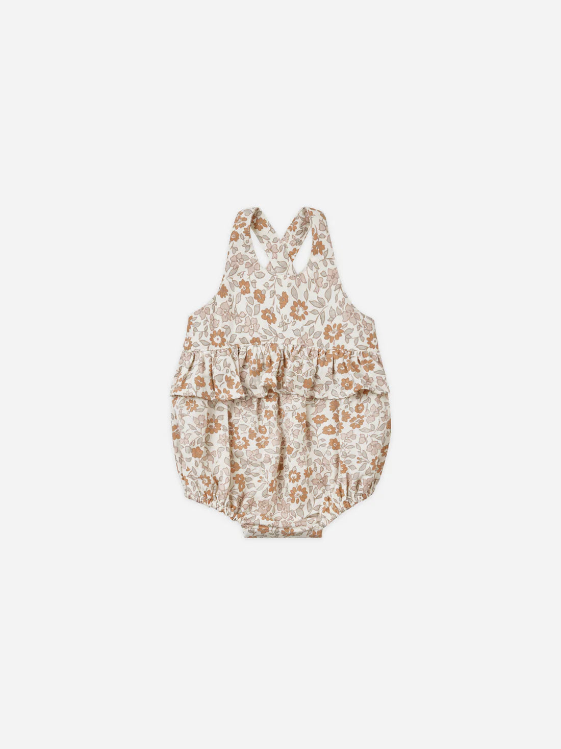 The Penny romper features a bubble silhouette, ruffle detail at the waistline, and adjustable crisscross straps. Bottom snap closure to ensure easy changing.