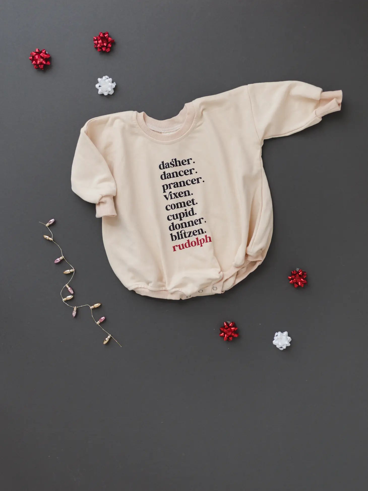 Reindeer names graphic oversized sweatshirt romper with snaps at crotch. Black lettering except for Rudolph in red. Lightweight terry material.