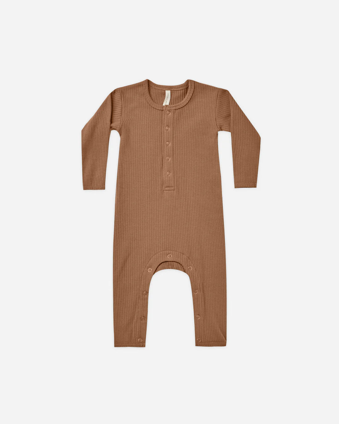 Baby jumpsuit in our stretchy rib knit. Slim fit with added stretch to grow with your baby. Snaps along inseam and down front for easy changing.