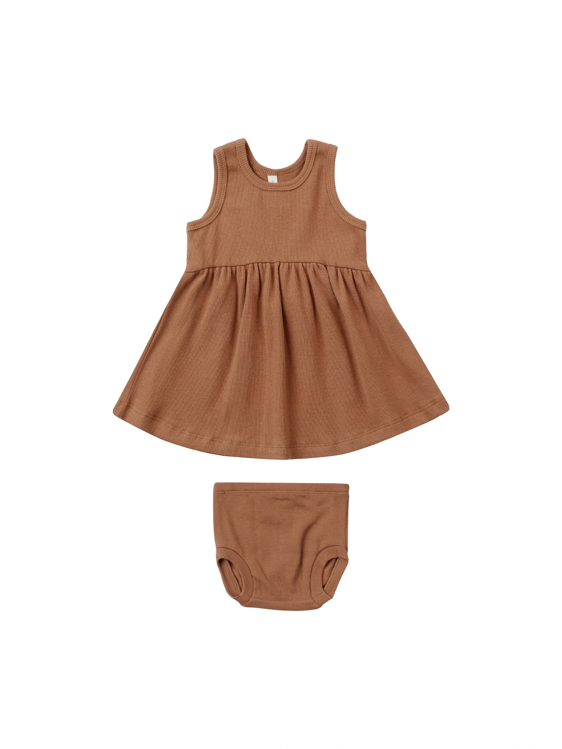 Our beloved ribbed tank swing dress is stretchy and comfortable. All sizes include coordinating bloomers.