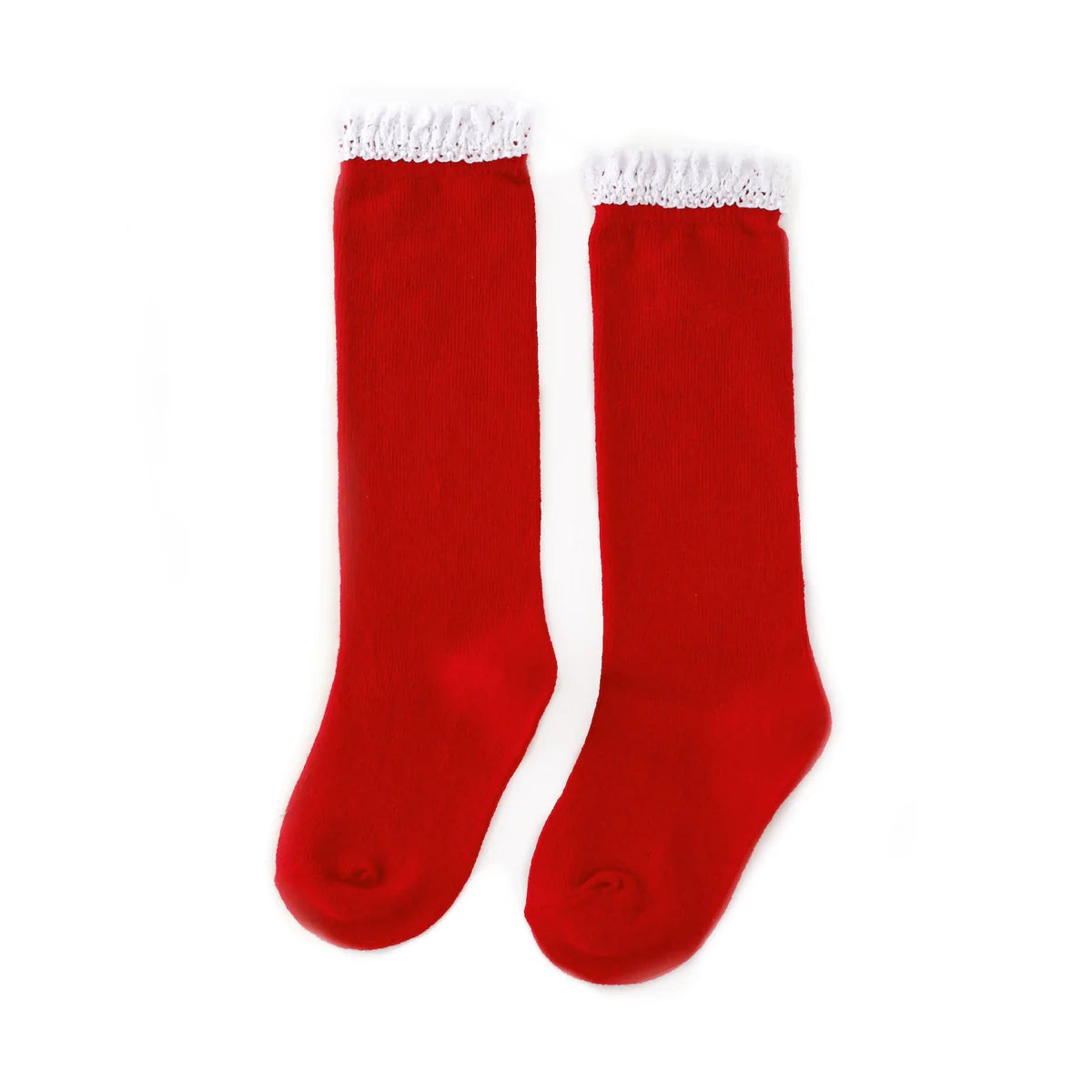 Everyone's favorite holiday sock is back! The cutest red and white lace trimmed knee high sock is a must-have for the holidays!