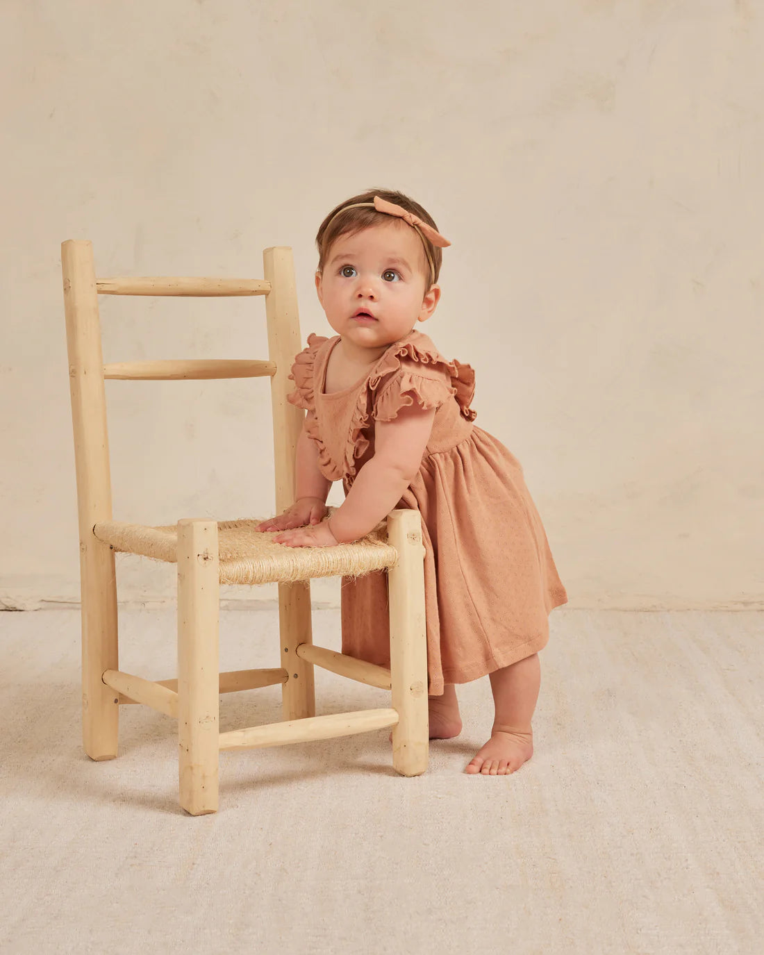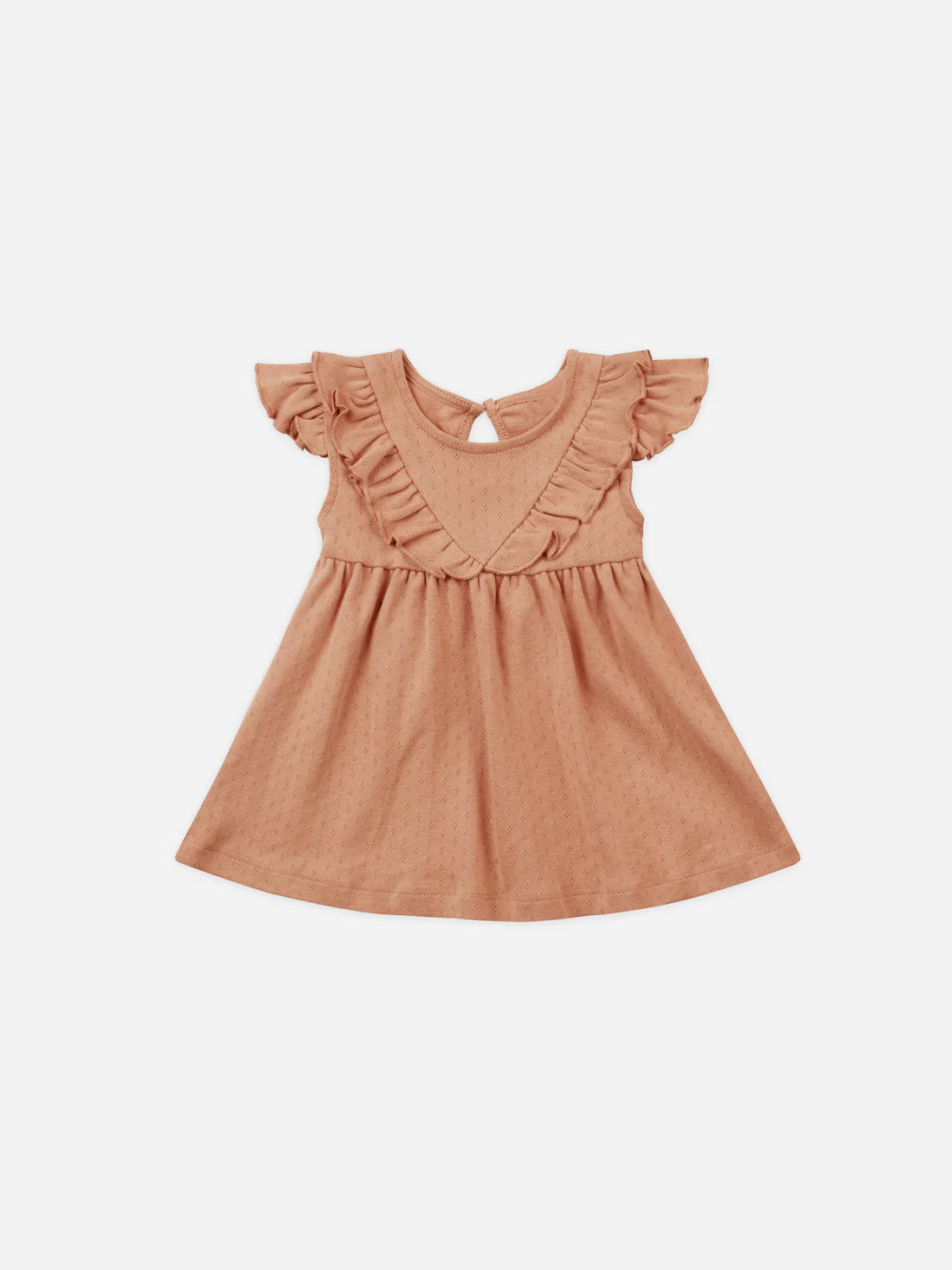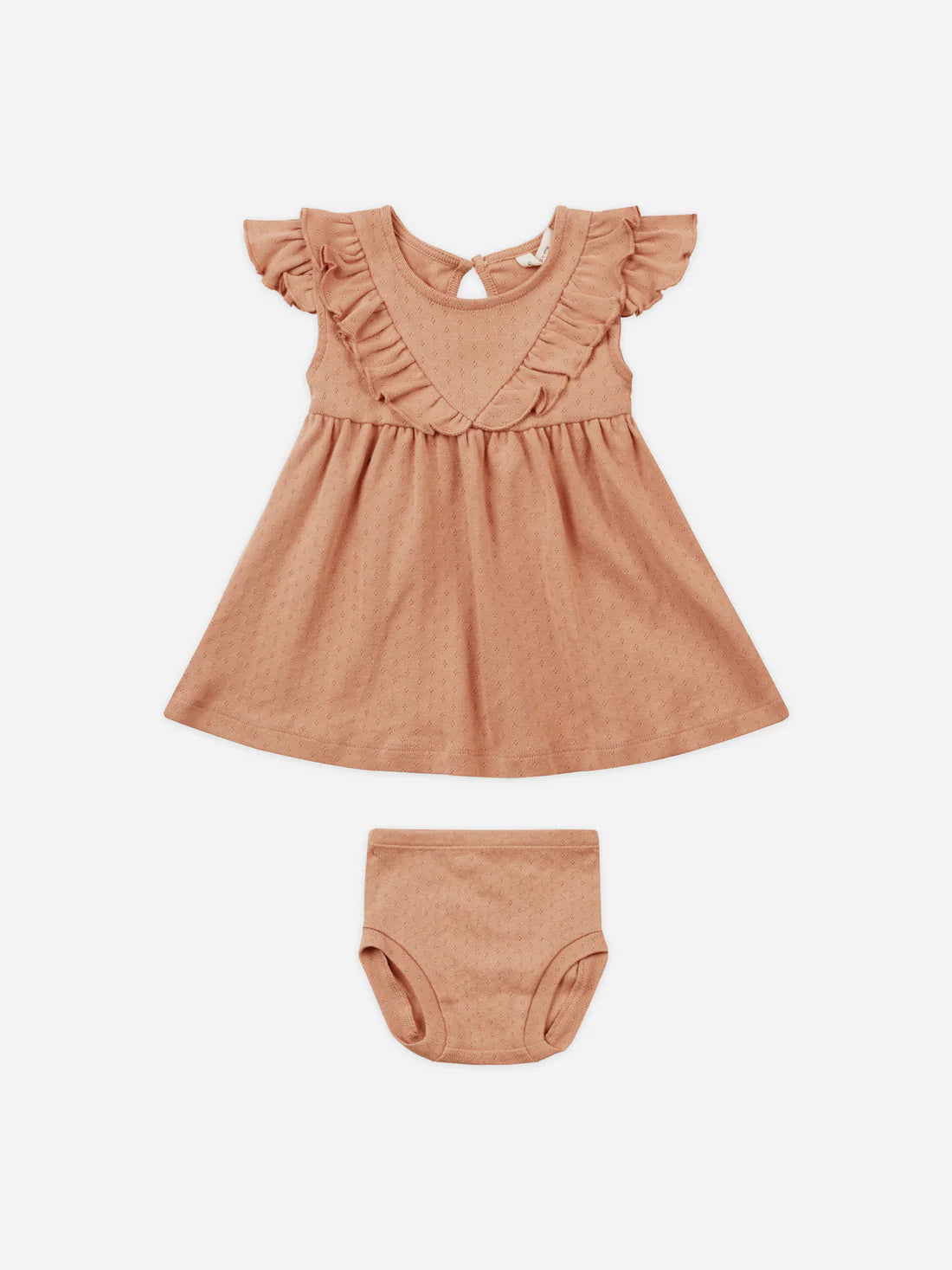 Flutter sleeve dress with sweet ruffle detail in our classic pointelle fabric. Button back closure for easy changing. All sizes include coordinating bloomers.