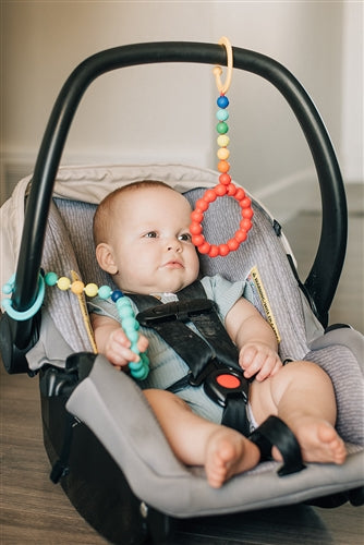 When you have a new baby, it can be challenging to be on the go running even a short list of errands. Getting everything done while keeping your baby occupied and happy is a hard task. Luckily, we carry beaded teething toys that attach to your stroller or playpen to keep your child busy while you cross tasks off your list. The silicone teething toys are perfect for your teething baby to chew on because they are made from safe rubber with no BPA, lead or metals.