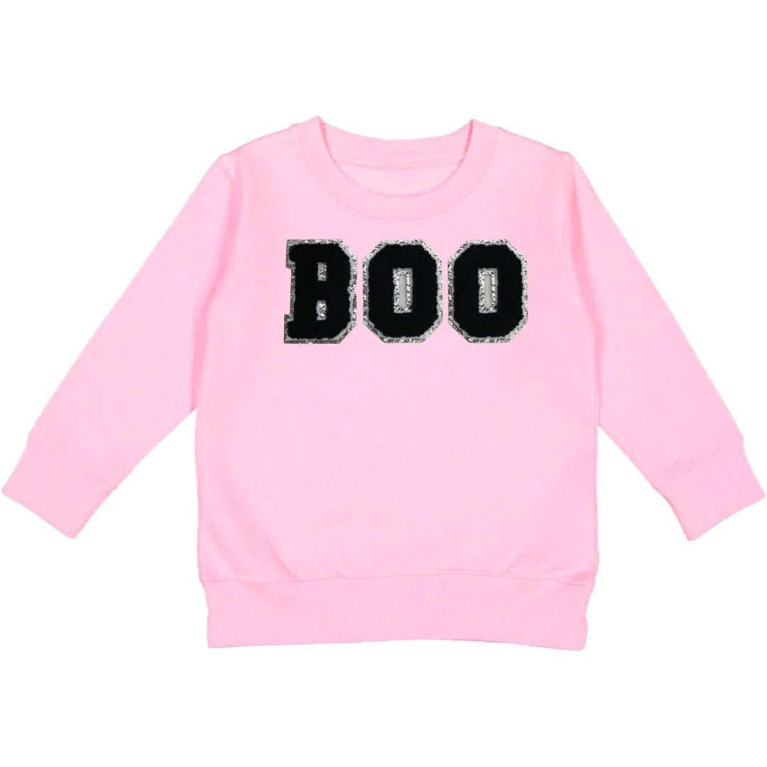 This sweatshirt features silver glitter outlined black patchwork letters spelling "B-O-O" on our signature light pink sweatshirt. It is made with our softest cotton for comfort, and is the perfect layer for Fall.