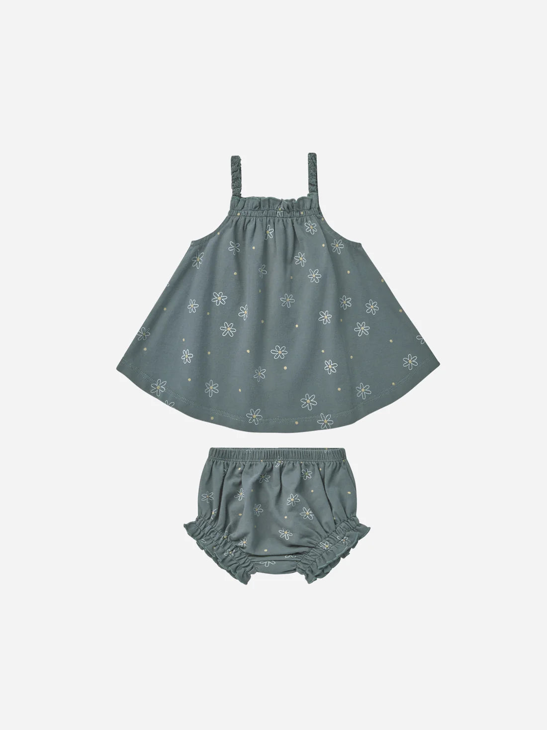 This set has a cute swing tank top featuring ruffled spaghetti straps and a gathered neck. Paired with matching bloomers.