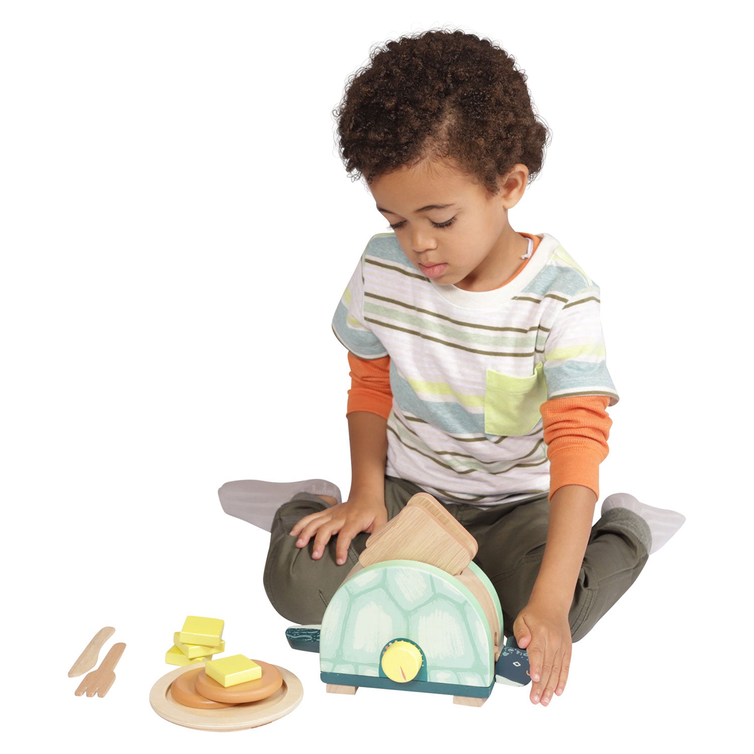 Toast up something extra special with the Toasty Turtle wood play set. The eleven-piece pretend play set includes one turtle-shaped toaster, one plate, two slices of toast, two bagel slices, one butter knife and four pieces of butter that cling together. Encourages imaginative role-play, cause and effect learning and motor skill development.